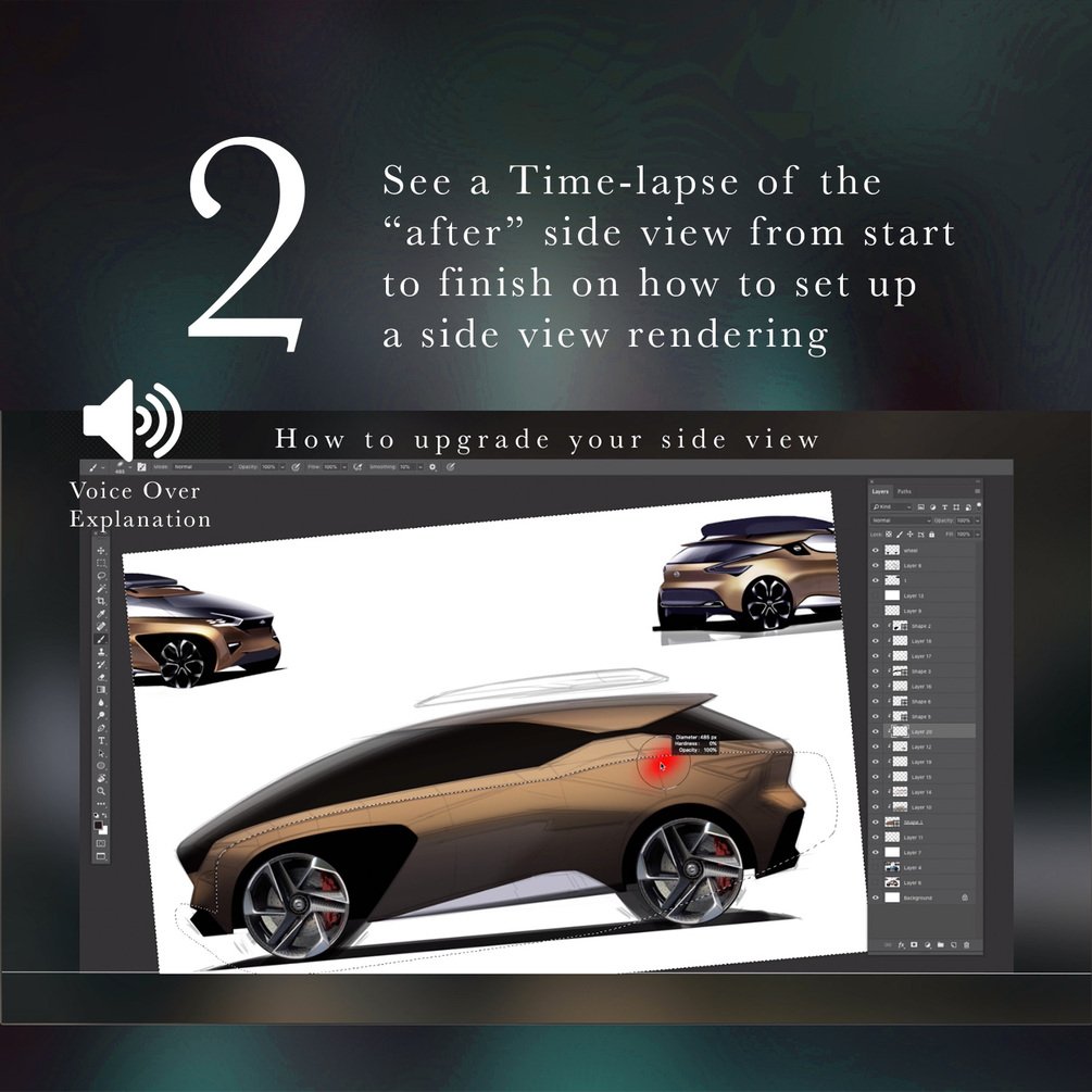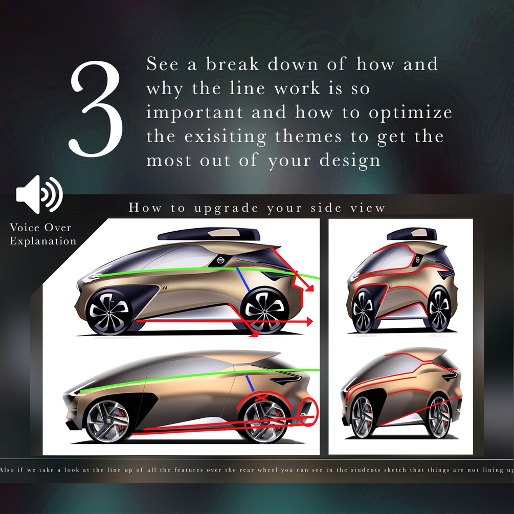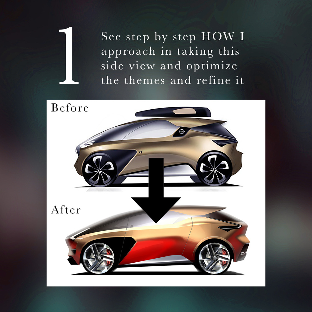 In this video I take one of my former student final side view proposals and take you step by step and show you how to refine the design WITHOUT changing the initial design theme, the purpose of this tutorial is to show you how to improve your existing design themes and take it to the next level, so that you can take the topics you will learn and be able to apply it on your own designs, to generate high design quality side views.