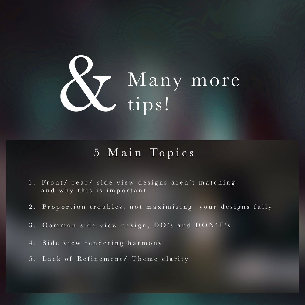 2. In depth design explanation regarding line work/ theme refinement/ design language/ DO's and DONT's of design and many more tips and tricks to improve your side view.